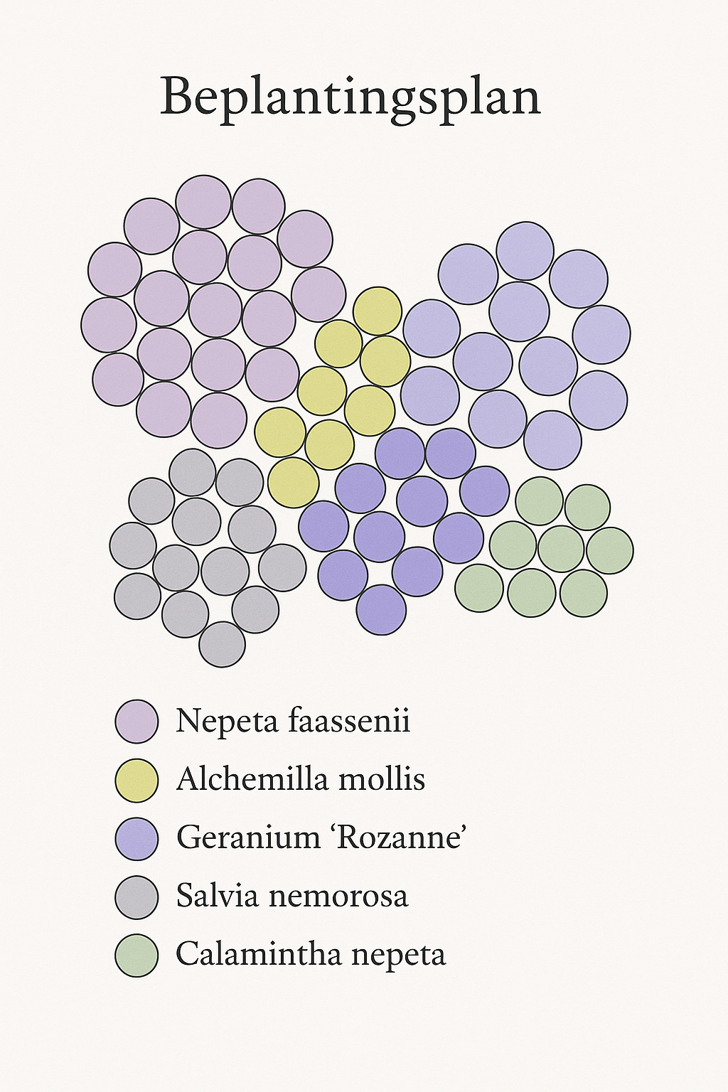 Visuele afwisseling: Opgaande groei, geurende accenten en bodembedekkende structuurplanten zorgen voor een speels geheel.