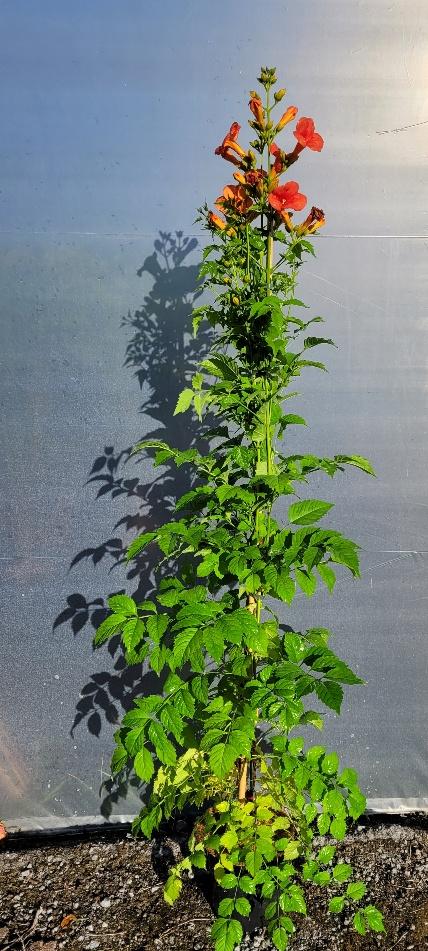 De Campsis 'Galen', ook wel Galen Trompetbloem genoemd, is een sterke en sierlijke klimplant die met zijn rijke, oranje-rode bloemen een opvallende toevoeging is aan elke tuin. De bloemen, die bloeien van juni tot september, hebben een prachtige trompetvorm en een lichte geur die vlinders en bijen aantrekt. Het donkergroene, glanzende blad vormt een mooi contrast met de levendige bloemen en blijft het hele jaar door zichtbaar. Deze plant is perfect voor het bedekken van muren, pergola’s en schuttingen, en creëert een weelderige, tropische sfeer.