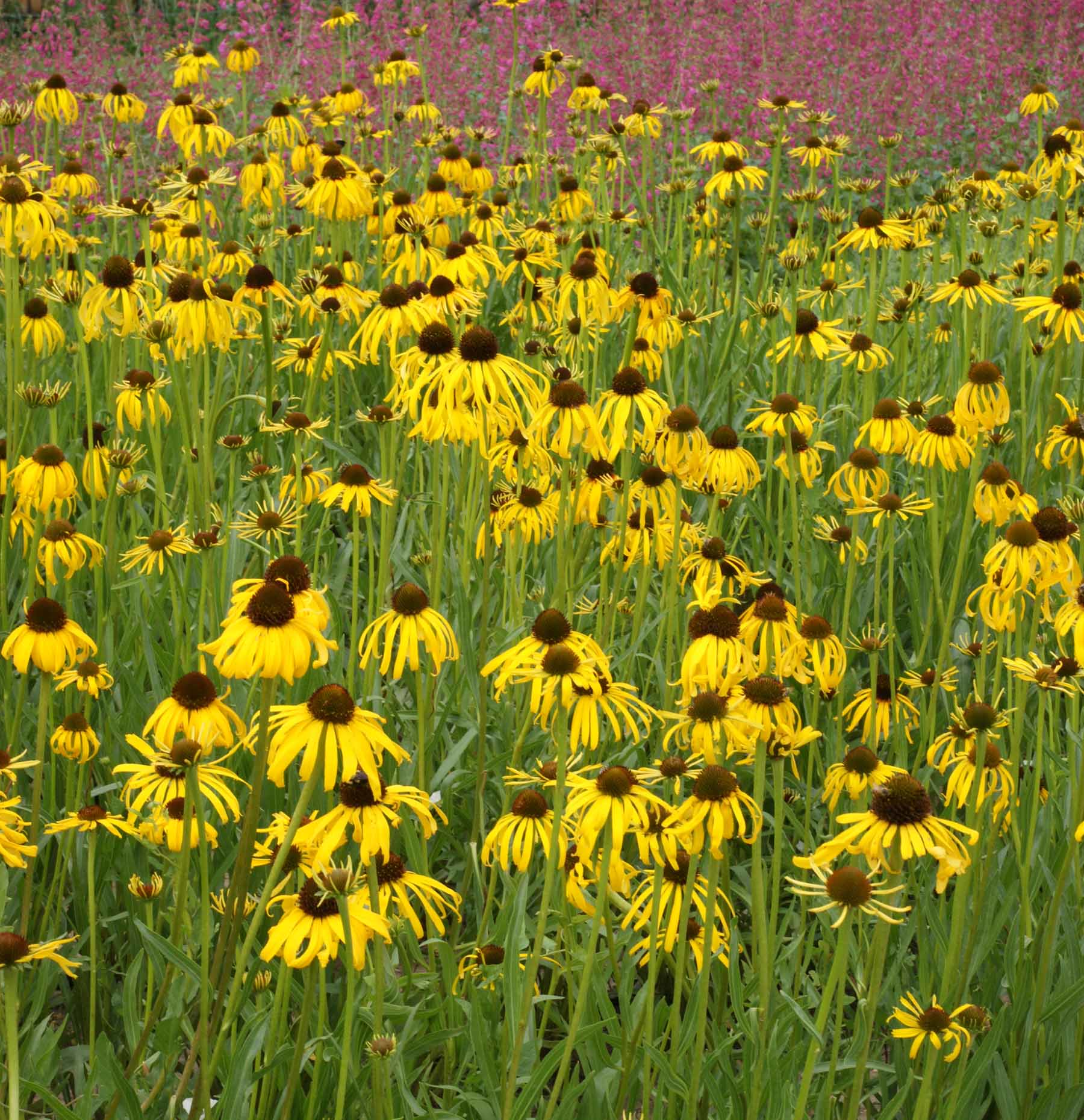 Bloei: Van juni tot augustus rijkbloeiend met margrietachtige bloemen met felgele bloemblaadjes en een kegelvormig, oranjebruin hart.