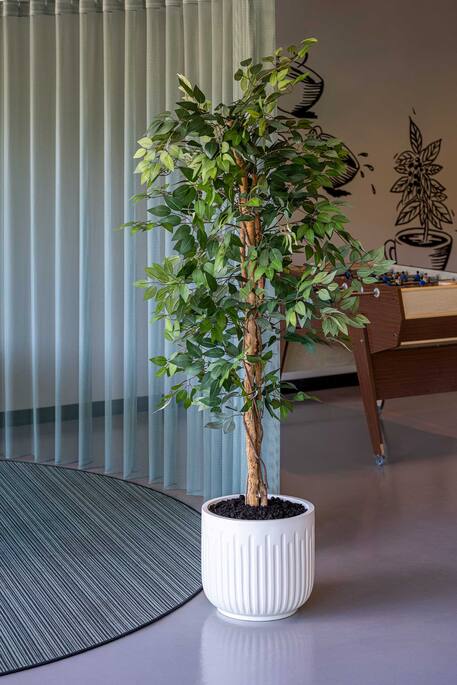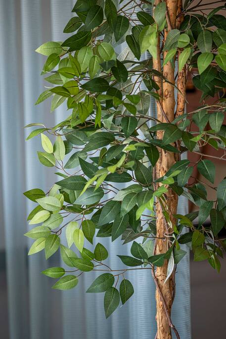 Combineer de Ficus Tree met een sierpot die aansluit bij de interieurstijl, bijvoorbeeld in keramiek, betonlook of een natuurlijke tint. In combinatie met andere kunstplanten ontstaat een gelaagd en evenwichtig geheel.