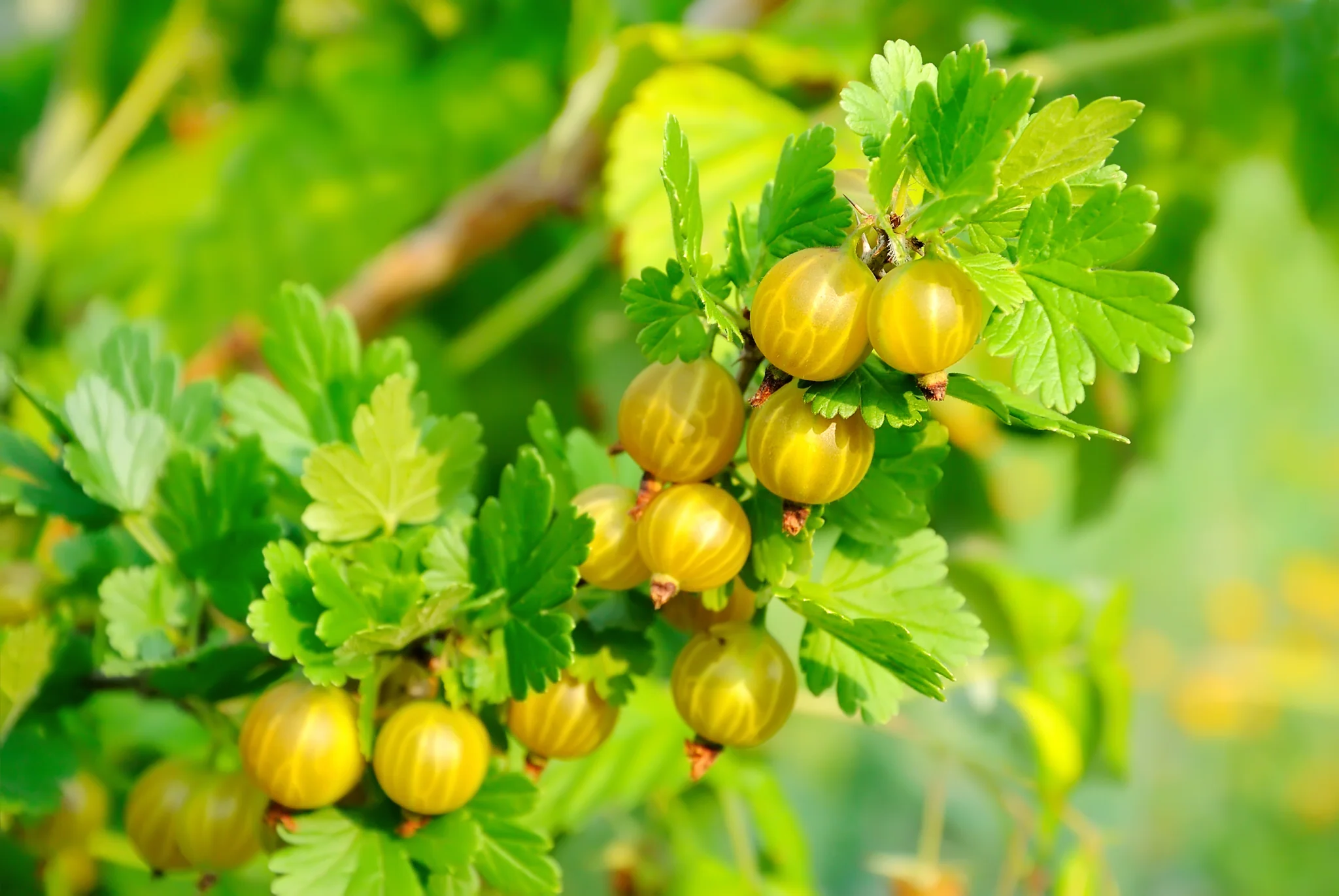 1x Ribes uva-crispa 'Geel' – Gele kruisbessen die een frisse, zure smaak hebben, ideaal voor het maken van gelei of om zo te eten.