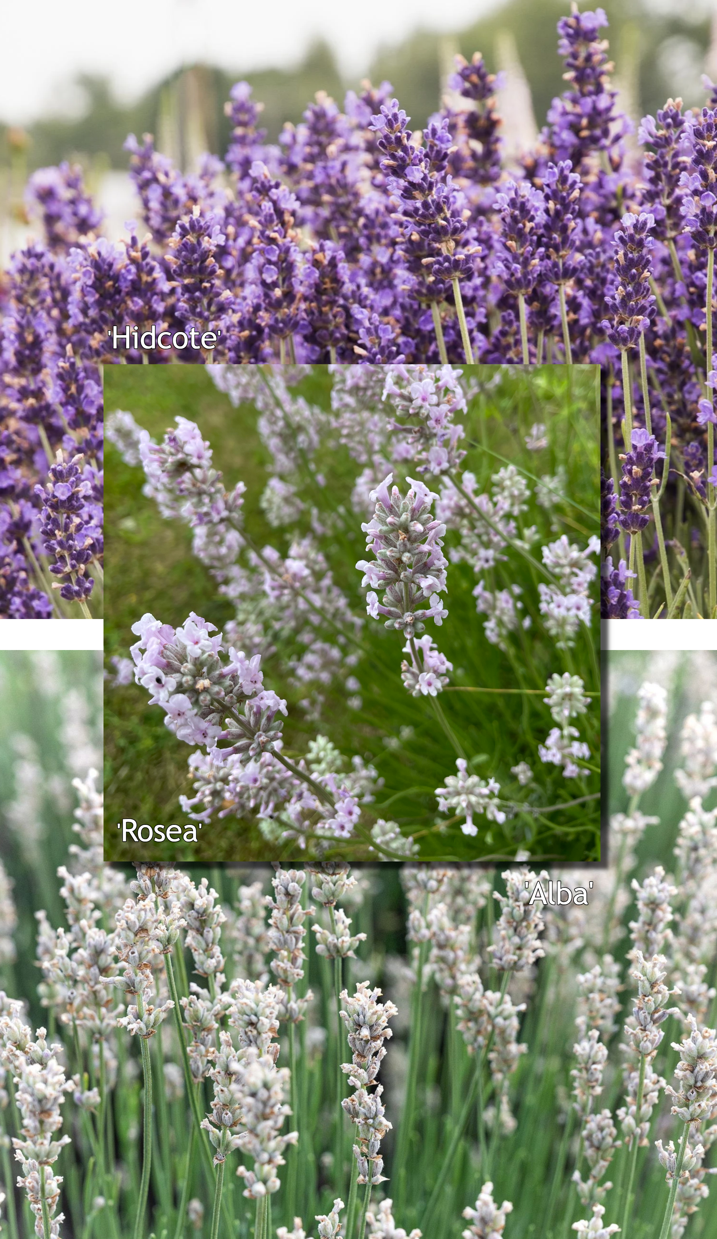 Bloemkleur: Dieppaars (Hidcote), zachtroze (Rosea), wit (Alba)