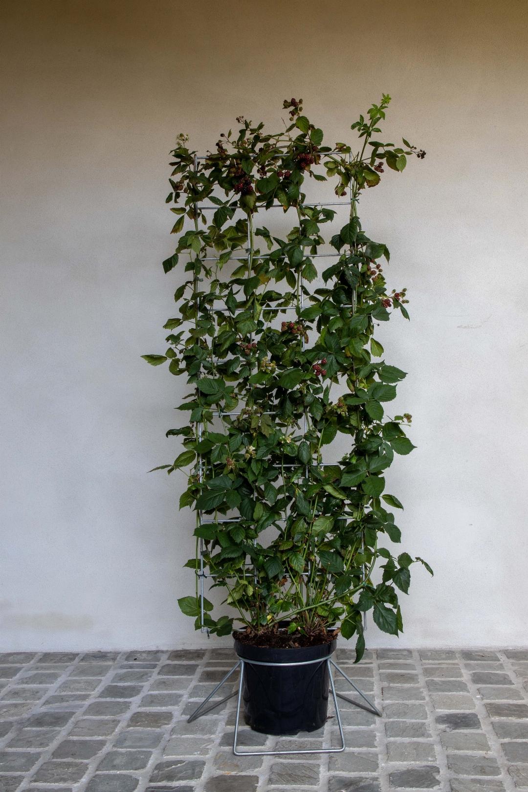 Deze Rubus fruticosus is gekweekt in een haagelement/rek van circa 150 cm hoog en 50 cm breed, waardoor de plant overzichtelijk groeit en ideaal is om als fruithaag of tegen een schutting te plaatsen.